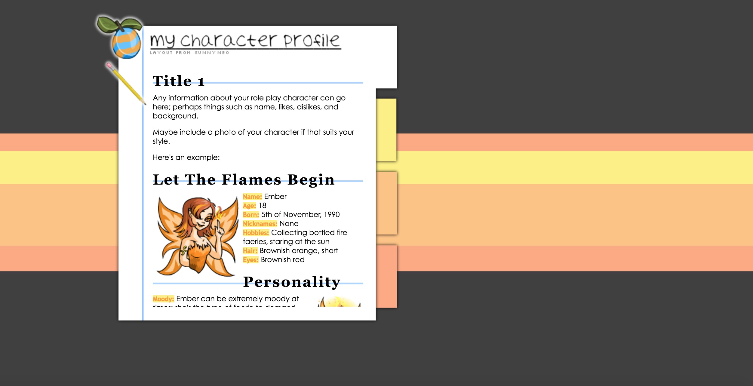 So what bits of information should you generally have with a rough character? There’s not too long of a list…Name: Age: Birthday: Gender: Species: Hair/Fur Color: Eye Color: Occupation: Home: